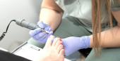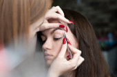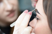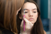 People. Beauty and health. Eyebrow flexing. The make-up artist corrects and colors the eyebrows of a young beautiful Caucasian girl. Close-up. Soft focus. Beauty saloon