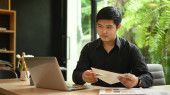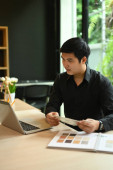 Asian man interior designers working with laptop and color palette, sketching and planning construction project on office desk.