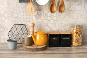 Zdjęcie "Kuchnia blat z różnych ceramicznych słoików i naczynia. Ceramiczne talerze, naczynia, naczynia i przytulny wystrój. Stylowy wystrój wnętrz kuchni scandi. Bukiet kwiatów wazon w domu." może być wykorzystywane do celów osobistych i komercyjnych zgodnie z warunkami zakupionej licencji Royalty-free. Obraz jest dostępny do pobrania w jakości wysokiej rozdzielczości do 5760x3840.