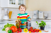 Dwóch małych chłopców śmieszne gotowania włoska zupa i posiłek z świeżych v