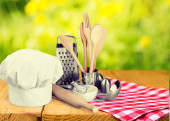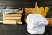 Composition with chef hat for concept of cooking, top view