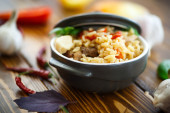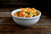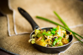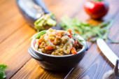 bakłażan smażony z innymi warzywami w talerzu na drewnianym stole