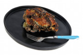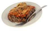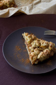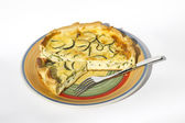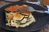 Cukinia gratin w talerzu z widelcem zbliżenie na białym tle