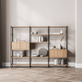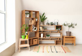 Półka z różnymi akcesoriami kąpielowymi i rośliną domową we wnętrzu łazienki
