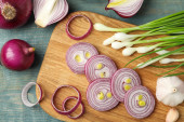 Cięcie czerwonej cebuli na drewnianej desce, zbliżenie