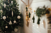 Świąteczne wieńce z lampkami i czerwonymi dekoracjami wiszącymi na ceglanej ścianie