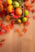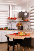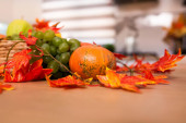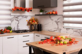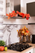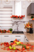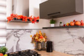 Jesienne wnętrze kuchni. Czerwone i żółte liście i kwiaty w wazonie i dynia na białym tle.