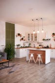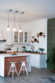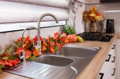 Jesienne wnętrze kuchni. Czerwone i żółte liście i kwiaty w wazonie i dynia na białym tle.