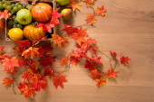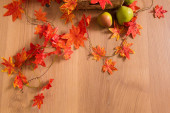 Peaceful Fall Fruit, Leaf, Acorn Still Life Arrangement on Wood Board Table Tło z miejscem na kopię, tekst, Twoje słowa