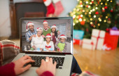 Zdjęcie "Biała matka i córka wykonują na laptopie świąteczną rozmowę wideo z rodziną. Boże Narodzenie, uroczystość i technologie komunikacyjne." może być wykorzystywane do celów osobistych i komercyjnych zgodnie z warunkami zakupionej licencji Royalty-free. Obraz jest dostępny do pobrania w jakości wysokiej rozdzielczości do 5760x3840.