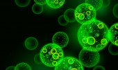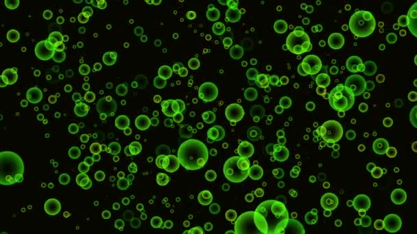 2D Ilustracja zielonych bakterii lub komórek wirusa unoszą się na ciemnym tle