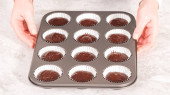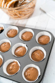 Podbieranie ciasta babeczkowego do wkładek babeczkowych do pieczenia czekoladowych babeczek truskawkowych.