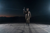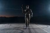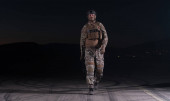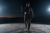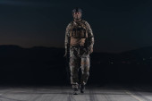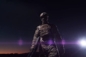 Żołnierz armii w mundurach bojowych z karabinem szturmowym, nosicielem talerzy i hełmem bojowym wyrusza na niebezpieczną misję w deszczową noc. Wysokiej jakości zdjęcie