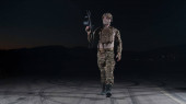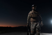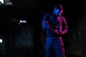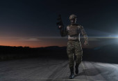 Zdjęcie "Żołnierz armii w mundurach bojowych z karabinem szturmowym, nosicielem talerzy i hełmem bojowym wyrusza na niebezpieczną misję w deszczową noc. Wysokiej jakości zdjęcie" może być wykorzystywane do celów osobistych i komercyjnych zgodnie z warunkami zakupionej licencji Royalty-free. Obraz jest dostępny do pobrania w jakości wysokiej rozdzielczości do 5760x3840.