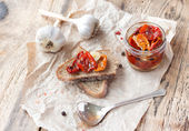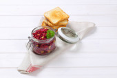 Pasztet drobiowy w słoiku i krojonego chleba z musztardą