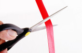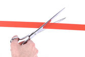 ręka mężczyzny cięcia czerwoną wstążką z nożyczkami