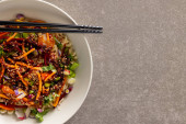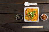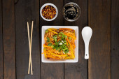 Zdjęcie "Widok z góry azjatyckiego wok mieszać makaron smażyć i pałeczki i przyprawy na drewnianym tle. Azji smaczne domu gotowane jedzenie i zdrowe odżywianie." może być wykorzystywane do celów osobistych i komercyjnych zgodnie z warunkami zakupionej licencji Royalty-free. Obraz jest dostępny do pobrania w jakości wysokiej rozdzielczości do 5760x3840.