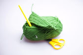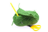 motek wełny, szydełko i dzianiny kawałek na białym tle