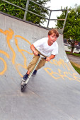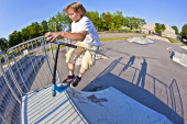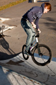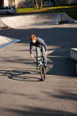 młody chłopak z Rude włosy to skoki z jego rower w skate parku