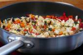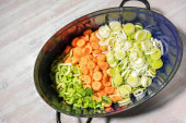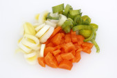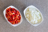 pokrojone warzywa w białe miski, przygotowanie do gotowania