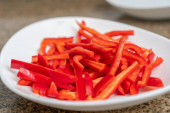 peaces czerwonej słodkiej papryki w misce biały, preparat do gotowania