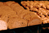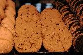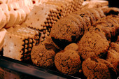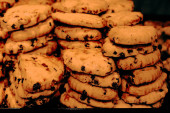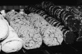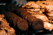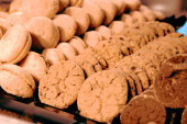 Grupa różnorodnych ciasteczek. Chipsy czekoladowe, rodzynki owsiane, biała czekolada