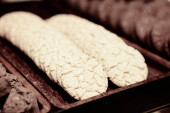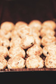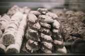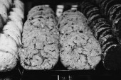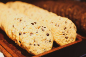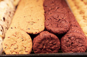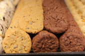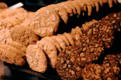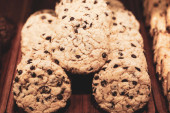Grupa różnorodnych ciasteczek. Chipsy czekoladowe, rodzynki owsiane, biała czekolada