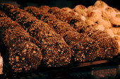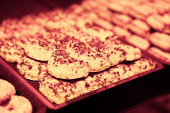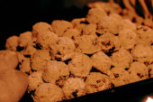 Grupa różnorodnych ciasteczek. Chipsy czekoladowe, rodzynki owsiane, biała czekolada