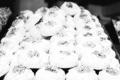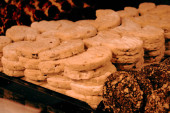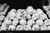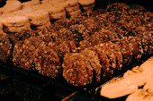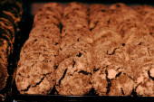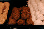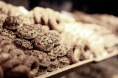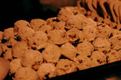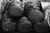 Grupa różnorodnych ciasteczek. Chipsy czekoladowe, rodzynki owsiane, biała czekolada