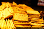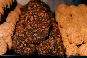 Grupa różnorodnych ciasteczek. Chipsy czekoladowe, rodzynki owsiane, biała czekolada