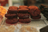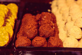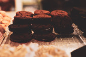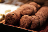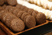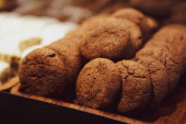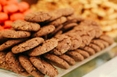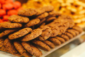 Grupa różnorodnych ciasteczek. Chipsy czekoladowe, rodzynki owsiane, biała czekolada