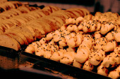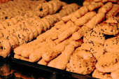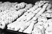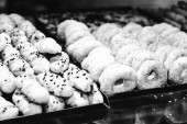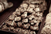 Grupa różnorodnych ciasteczek. Chipsy czekoladowe, rodzynki owsiane, biała czekolada