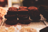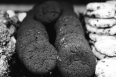 Grupa różnorodnych ciasteczek. Chipsy czekoladowe, rodzynki owsiane, biała czekolada