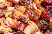 Ojakhuri, Tradycyjne gruzińskie danie, smażone ziemniaki z mięsem, w glinianej patelni, widok z góry, nie ma ludzi, domowej roboty,