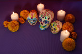 Czaszki cukru ze świecą, kwiaty Cempasuchil lub Marigold i Papel Picado. Dekoracje tradycyjnie używane na ołtarzach do świętowania dnia zmarłych w Meksyku