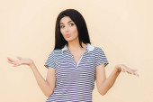 Zdjęcie "Piękna kobieta ma clueless wyrażenie, wzrusza ramionami, trzyma usta okrągłe, wygląda niezdecydowany na bok, ubrany w ubranie, na białym tle nad studio tło. Koncepcja ludzie i niepewności" może być wykorzystywane do celów osobistych i komercyjnych zgodnie z warunkami zakupionej licencji Royalty-free. Obraz jest dostępny do pobrania w jakości wysokiej rozdzielczości do 5760x3840.