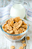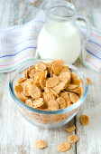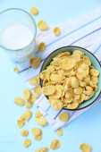 płatki kukurydziane miska śniadanie jedzenie i przekąska dla zdrowej koncepcji żywności, śniadanie świeże całe ziarna zbóż, płatki kukurydziane z mlekiem na żółtym tle
