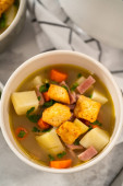 Zdjęcie "Podawanie zupy z makaronem z kluski w białych ceramicznych miskach zupy." może być wykorzystywane do celów osobistych i komercyjnych zgodnie z warunkami zakupionej licencji Royalty-free. Obraz jest dostępny do pobrania w jakości wysokiej rozdzielczości do 5760x3840.