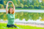 rudowłosa dziewczyna idzie sportowych w pobliżu jeziora