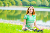 młoda dziewczyna siedzi na trawie i piękny uśmiech