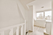 Biały korytarz z drewnianymi schodami prowadzącymi na drugie piętro nowoczesnego luksusowego apartamentu z minimalistycznym wystrojem wnętrz
