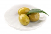 Zielone oliwki w okolicy: czarny z liści na białym tle