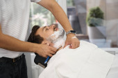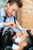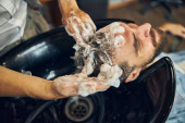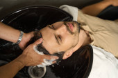 Widok z boku zdjęcie zrelaksowanego dżentelmena brunet z umytymi włosami w salonie fryzjerskim