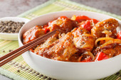 Zdjęcie "Azjatycki wieprzowina z ananasem w sosie słodko-kwaśnym. widok z góry" może być wykorzystywane do celów osobistych i komercyjnych zgodnie z warunkami zakupionej licencji Royalty-free. Obraz jest dostępny do pobrania w jakości wysokiej rozdzielczości do 5760x3840.