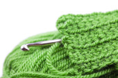 motek wełny, szydełko i dzianiny kawałek na białym tle