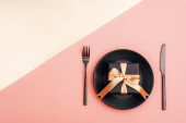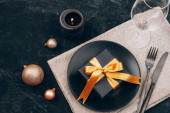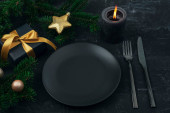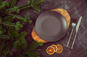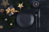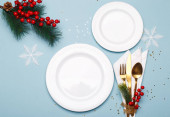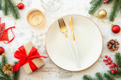 Stylowe nakrycie stołu, gałązki jodły, gwiazdy i kulki z białym talerzem, sztućce i beżowa serwetka na białym stole. Koncepcja świąt. Widok z góry, płaski.