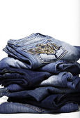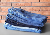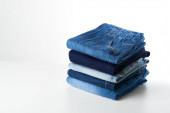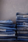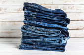 Niebieskie dżinsy stos dżinsów na tle stołu. Jeansy stos tkaniny jako powierzchnia materiału