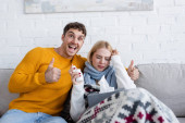 wesoła młoda para w szalikach machająca dłońmi podczas rozmowy wideo na laptopie