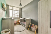 Wnętrze nowoczesnej sypialni dziecięcej z łóżkiem i półkami z różnymi zabawkami w domu