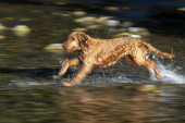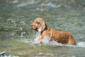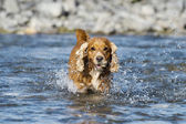szczęśliwy pies cocker spaniel zabawy w rzece wody
